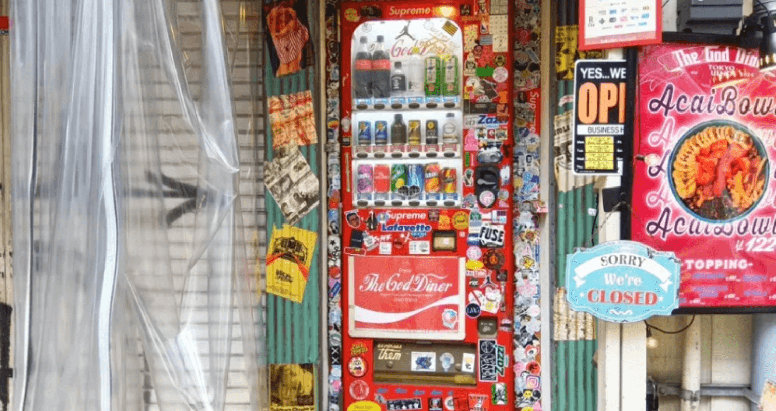 Hidden in Ueno, The God Diner isn’t your typical eatery. From the outside, it looks like an oversized, weathered 1990s Japanese drinks vending machine—complete with faded decals, glowing red “SOLD OUT” lights, and a coin slot. But this machine doesn’t dispense Pocari Sweat or Calpis… it opens like a door.